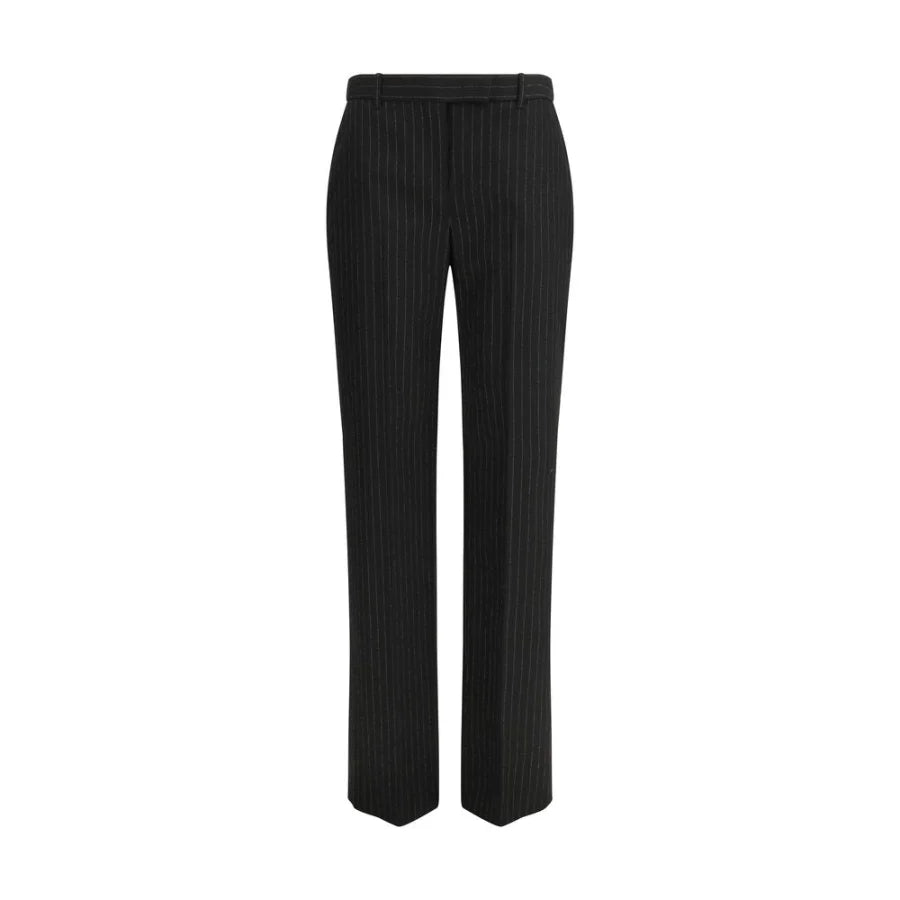 The pinstriped tailored Trousers by Alexander McQueen convey a sharp, contemporary elegance where classic tailoring meets modern femininity. Cut in a regular fit with a medium-rise waist, they offer a balanced silhouette enhanced by the refined pinstripe pattern. Side pockets and rear welt pockets preserve a clean, structured line, while concealed zip and hook fastenings ensure a sleek finish. Designed to fit true to size, these trousers are a sophisticated foundation for polished, confident looks.