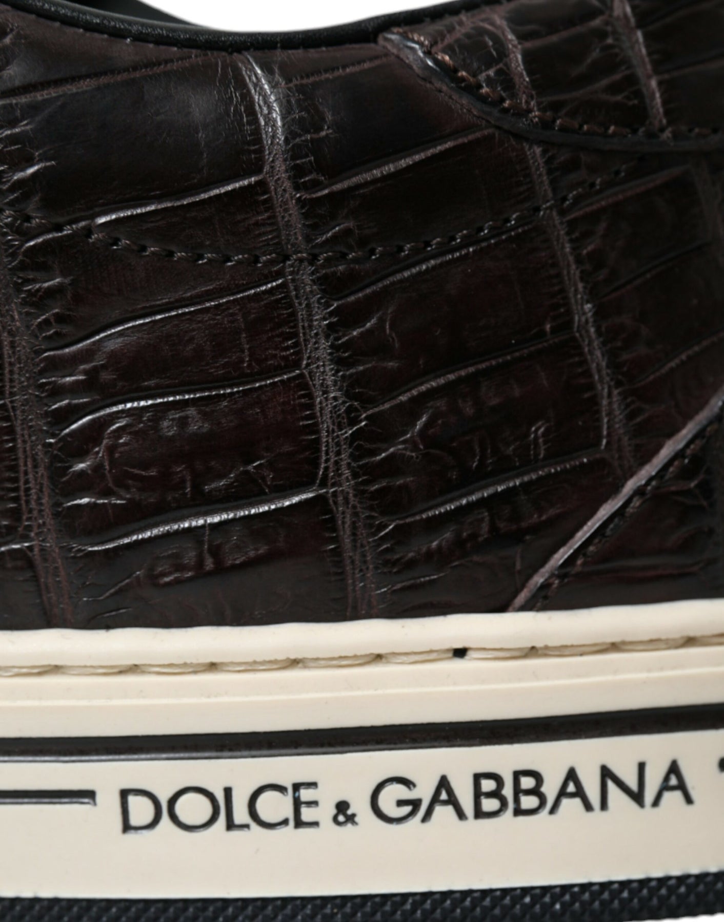 Descubre la personificación del calzado de lujo con estas exquisitas zapatillas bajas, confeccionadas en piel de cocodrilo 100 % premium. Estas auténticas zapatillas Dolce & Gabbana, nuevas con etiqueta, prometen una incorporación impecable a tu armario. Con un clásico tono marrón, lucen cordones, puntera redonda y detalles de rayas en la entresuela, combinando a la perfección estilo y comodidad. La suela de goma garantiza durabilidad y una pisada suave. Realza tu colección de zapatos con esta obra maestra italiana.