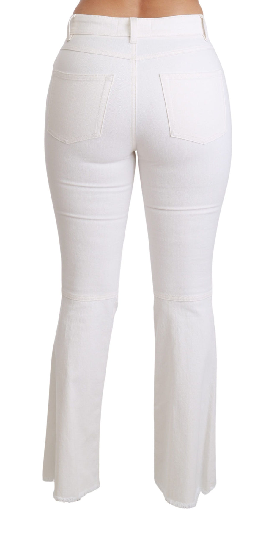 Sumérgete en la sofisticación con estos impecables pantalones acampanados de cintura media de Dolce & Gabbana. Confeccionados con la combinación perfecta de algodón y elastano para mayor comodidad y un ajuste favorecedor, estos pantalones lucen un blanco impecable, adornados con un llamativo bordado de corazones rojos y dorados que añade un toque de glamour romántico a tu look. Con una elegante cremallera y bragueta de botones, y sutiles detalles del logotipo, estos pantalones son un testimonio de la artesanía y el estilo italianos.