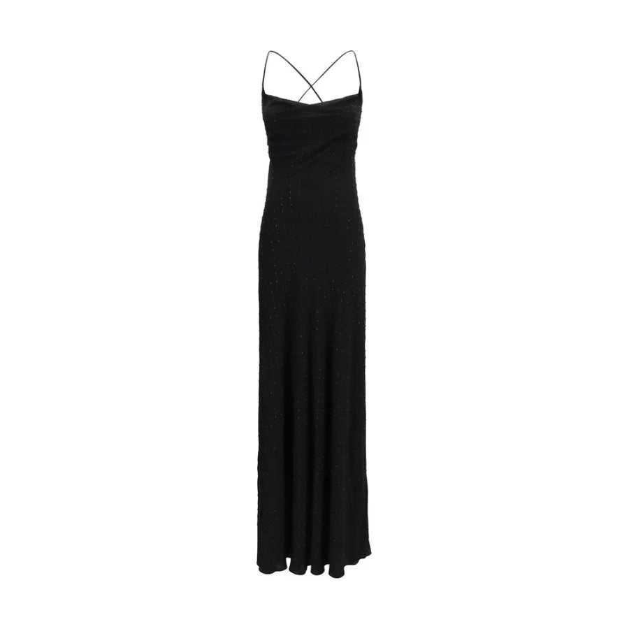 The long strass Slipdress by Pinko expresses a bold sense of femininity through a fluid and luminous silhouette. Designed with a slip-style construction, it features delicate shoulder straps and a softly draped front neckline that follows the body with ease. The back reveals a wide round opening, leaving the back exposed and defined only by two tie ribbons at the center. Crafted from matte georgette, the dress is embellished with all-over strass, turning the piece into a striking and unmistakable expression of the Pinko aesthetic.