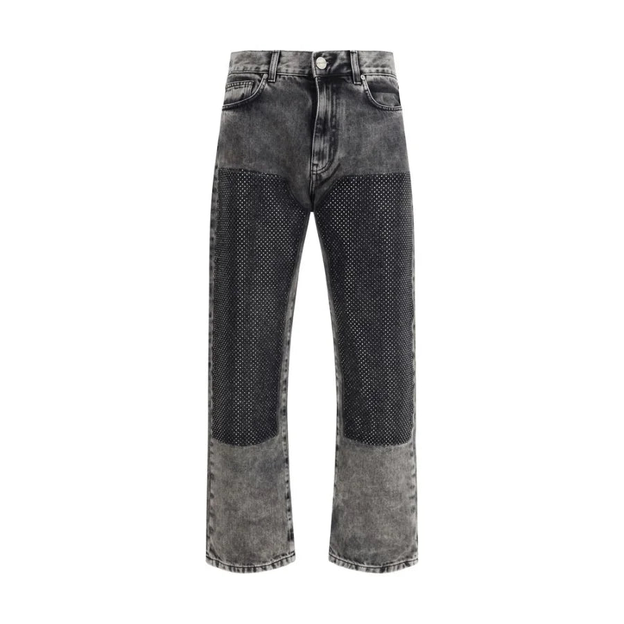 The Pinko five-pocket jeans in black stone-washed denim feature a loose-fit, contrast patches, and small faceted studs, with mid-rise waist, belt loops, and zip and button closure, combining workwear style with contemporary details.