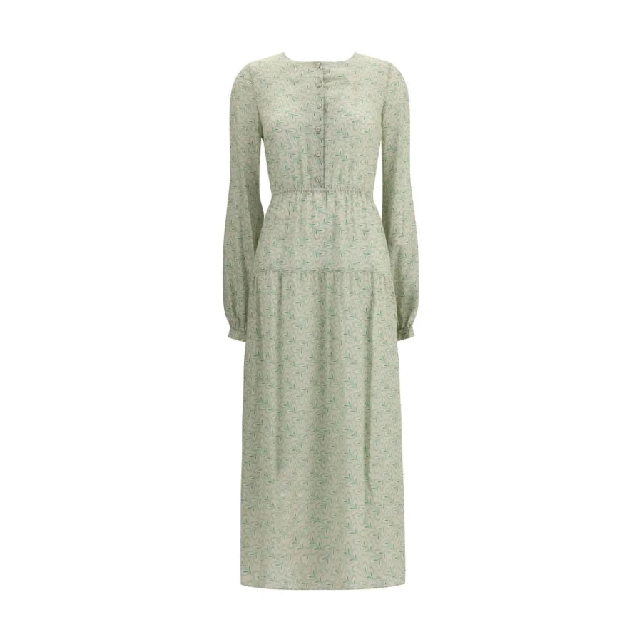 Kristina Ti’s Silk long Dress is a fluid and feminine garment enhanced by a delicate foliage print. The mid-bust button closure gives a discreet and elegant touch, while the elasticized waist enhances the silhouette naturally.