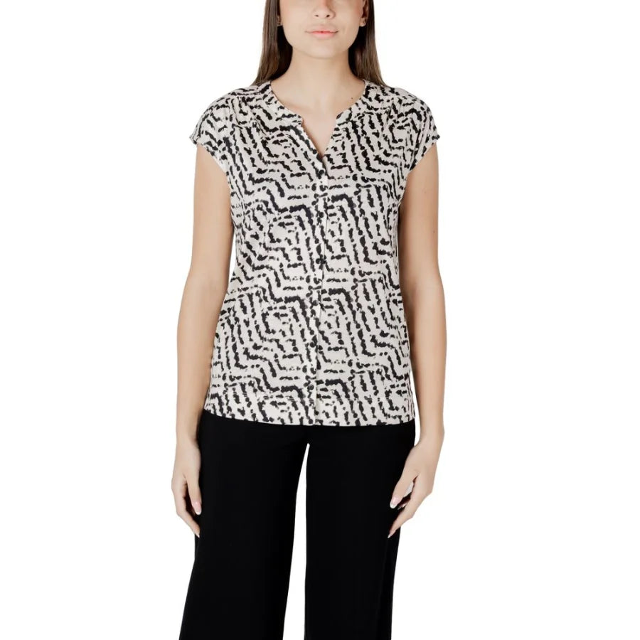 Discover the short-sleeved t-shirt by Street One, a versatile and stylish piece perfect for any occasion. Made from a blend of 50% cotton and 50% modal, it provides a soft and comfortable feel against the skin. The unique print and button panel add a touch of elegance and originality, making it ideal for a casual-chic look. Perfect to pair with elegant trousers or jeans for a standout everyday outfit.