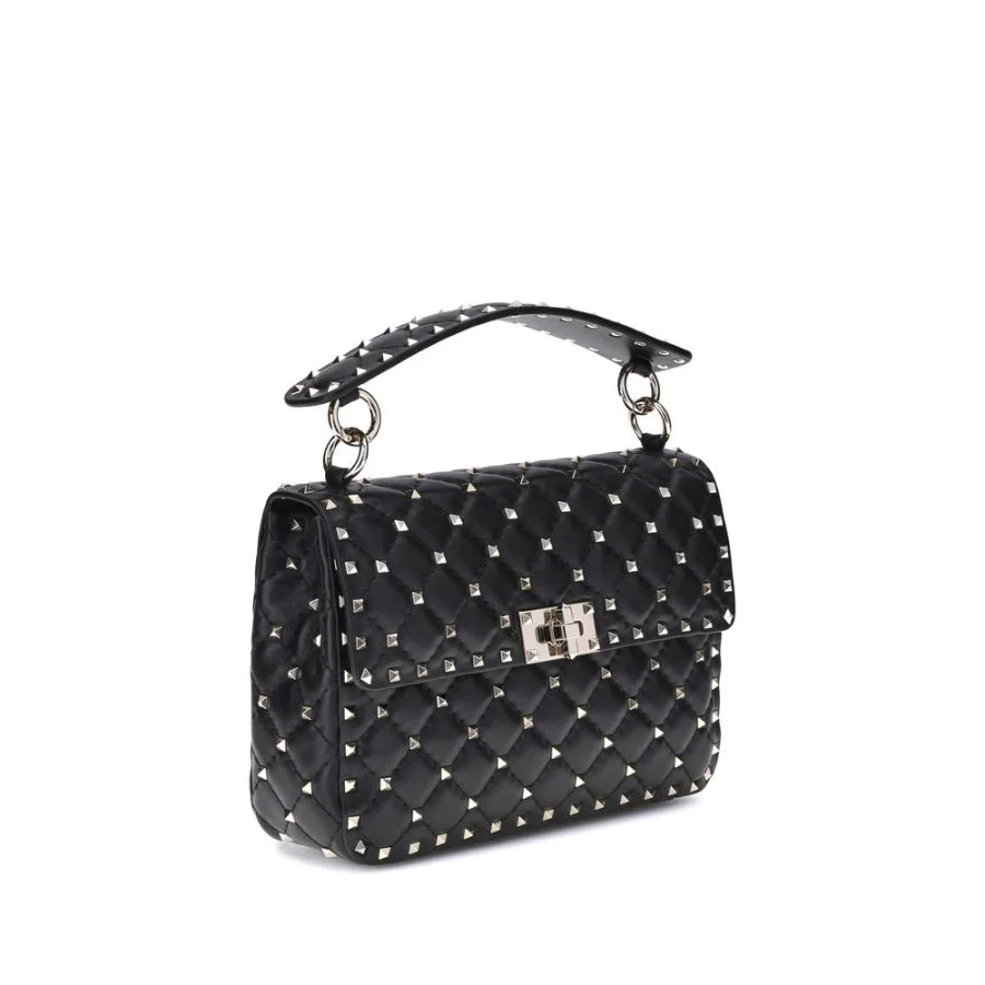 Valentino Garavani’s Rockstud Spike medium Shoulder Bag is an iconic model with a bold character, crafted in diamond-quilted leather and decorated with gold-tone Rockstud studs across the surface. Featuring a removable studded black leather top handle and adjustable smooth leather shoulder strap, it combines style and practicality. The well-organized interior features two zippered pockets and three card slots. The front flap and swivel closure completes the design with a sophisticated touch.