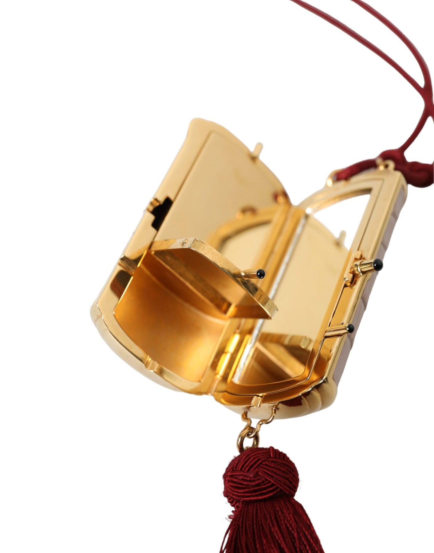 Laissez-vous séduire par l'opulence de Dolce & Gabbana avec ce superbe sac Mini Mirror, 100 % authentique. Idéal pour vos retouches en déplacement, cet accessoire est à la fois pratique et chic. Orné d'une bandoulière ornée de pompons fantaisie, il vous permet de garder les mains libres tout en restant à la pointe de la mode. Son cuir exotique rose raffiné est sublimé par des détails en métal doré, ajoutant une touche de luxe à toutes vos tenues. Cette pièce magnifiquement confectionnée reflète le savoir-faire italien de haut niveau et un design exclusif, ce qui en fait un ajout précieux à votre collection.