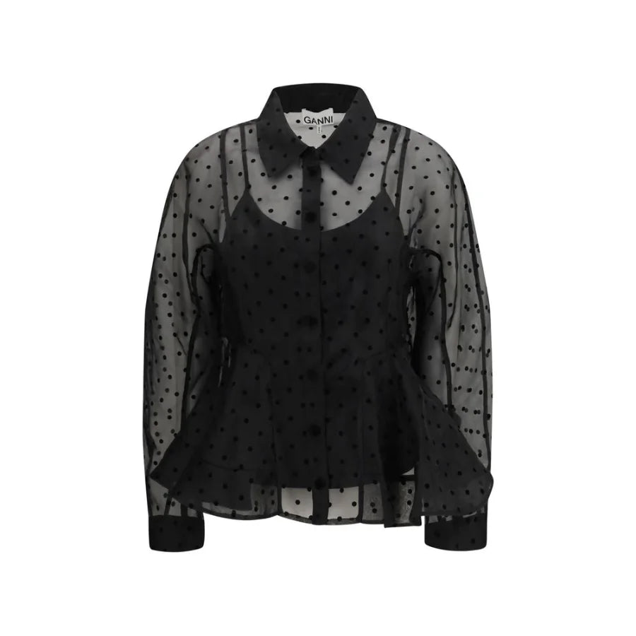 The polka dot organza Shirt by Ganni is an elegant and refined garment that plays with a mix of delicacy and modern style. The classic collar and front button closure add a touch of sobriety, while the curved sleeves and peplum silhouette add an element of originality and movement. The slight transparency of the organza and the polka dot pattern make this shirt perfect for those looking for a sophisticated yet fresh and feminine look. Ideal for a versatile outfit, it can be worn on special occasions as well as in more casual-chic settings.