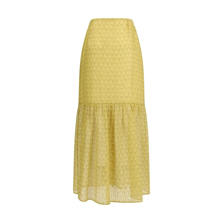 The Leonine Amnesia long Skirt by Kristina Ti expresses a romantic, sophisticated femininity. Crafted from striped jacquard silk with a floral print, it features a regular waist and a central button fastening extending to the knee, creating a front slit that subtly reveals the legs. A gathered ruffle at the hem adds movement and lightness to the silhouette. A striking piece, especially when paired with the Melania knit.