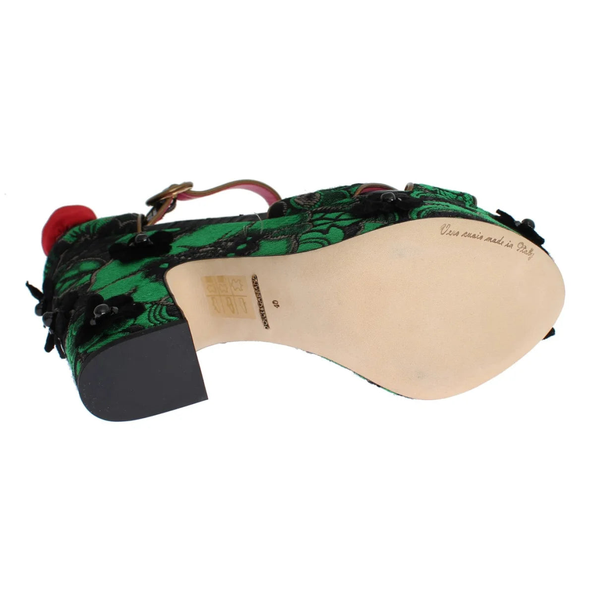 Plongez dans le luxe avec ces exquises sandales compensées Dolce & Gabbana, ornées d'un luxueux motif en brocart et jacquard vert, ornées de roses rouges romantiques et de cristaux noirs scintillants. Parfaites pour les occasions glamour, ces sandales arborent de superbes détails en métal doré et une élégante bride à la cheville, reflet du savoir-faire exceptionnel de la collection exclusive MainLine. Dotées d'une semelle en cuir et d'une charmante semelle intérieure rose, ces chaussures allient style et confort. Fabriquées à la main en Italie, elles témoignent d'une élégance intemporelle.