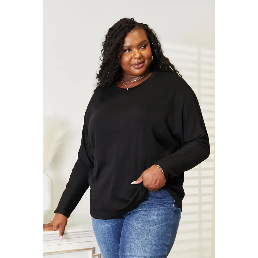 Haut sophistiqué à manches longues et col rond, indispensable dans toute garde-robe