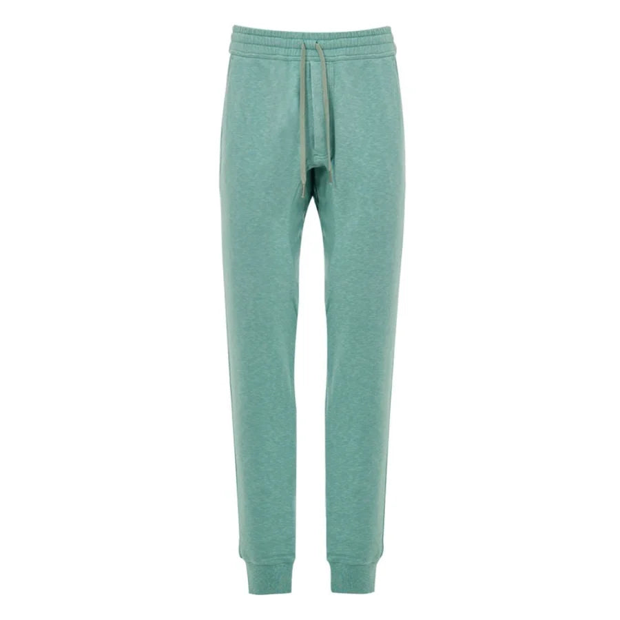 Elastic waist with adjustable drawstring, covered button placket, two side pockets, two back patch pockets. Relaxed fit with cuffs on the bottom.
