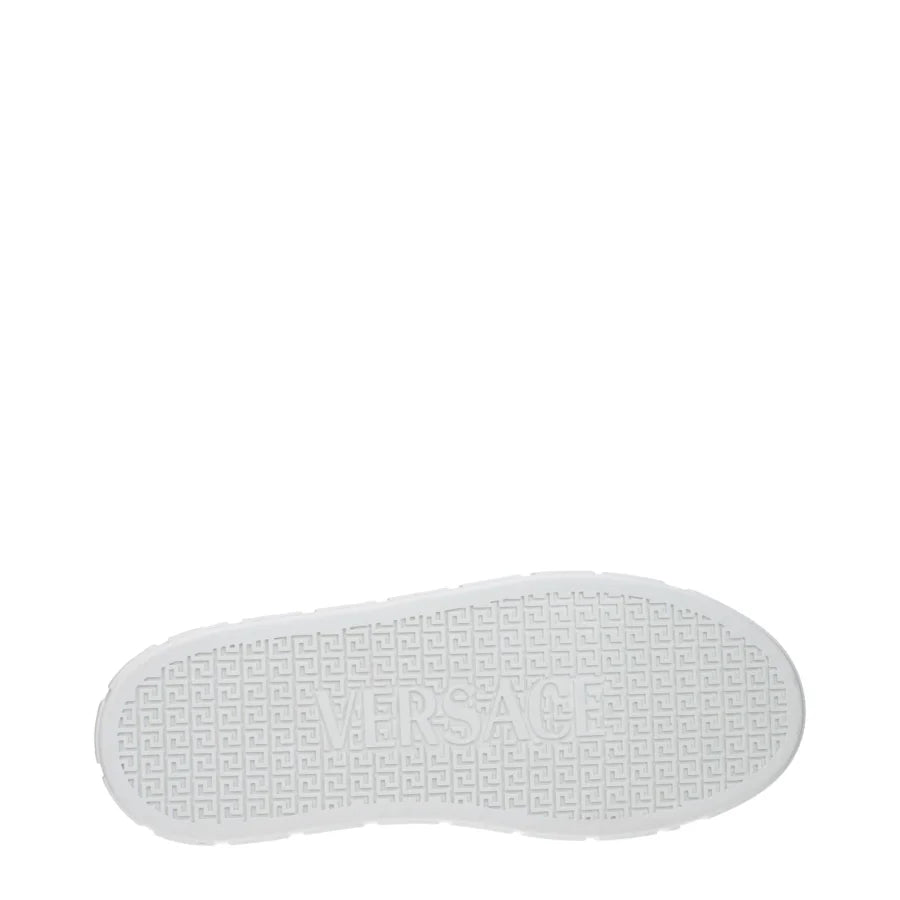 The product with MPN 10144601A124236WE10 and code F82530 leather in white is a sneakers designed by Versace. It has features like front logo, side logo, back logo.
