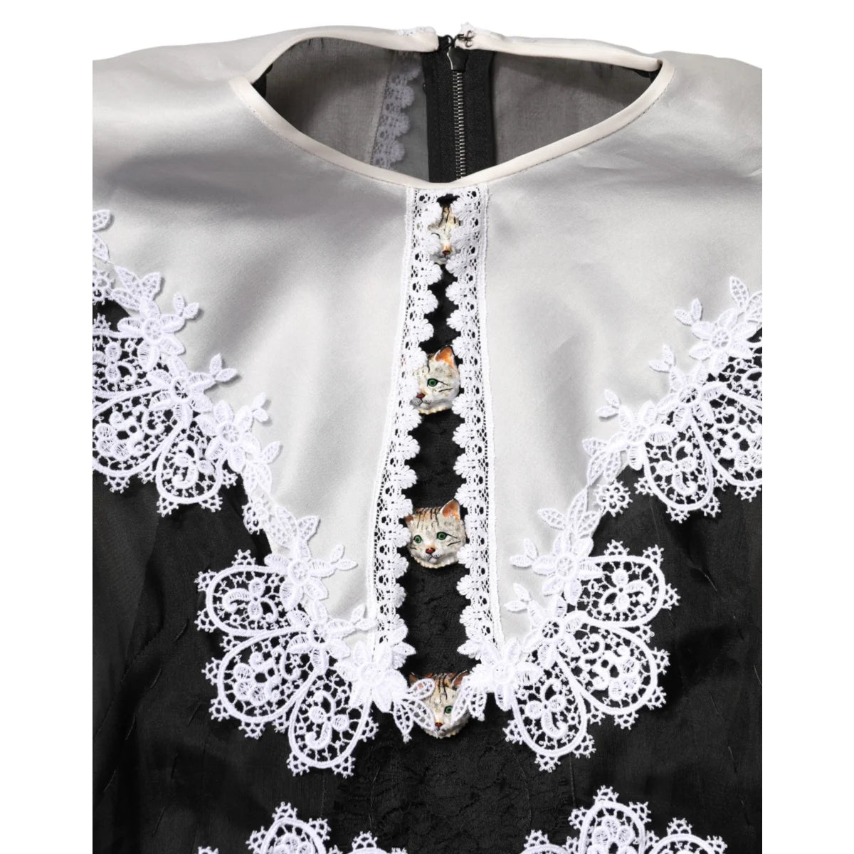 Dolce & Gabbana Black and White Silk Midi Dress with Macramé Lace