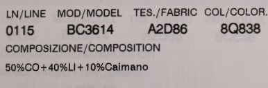 Material: 50% Cotton, 10% Cayman leather, 40% Linen