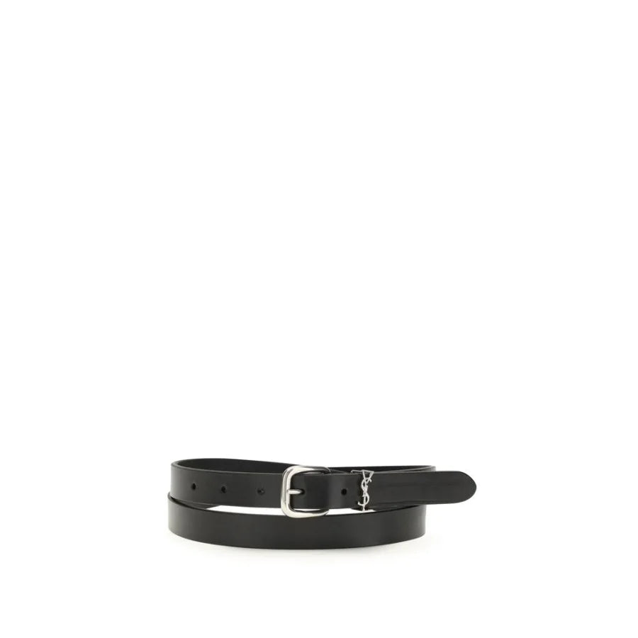 The Cassandre Belt with silver buckle by Saint Laurent is crafted from high-quality calfskin leather. Featuring a round buckle and loops with the Cassandre logo, it has silver-tone metal details and an adjustable buckle, combining classic elegance with distinctive design.