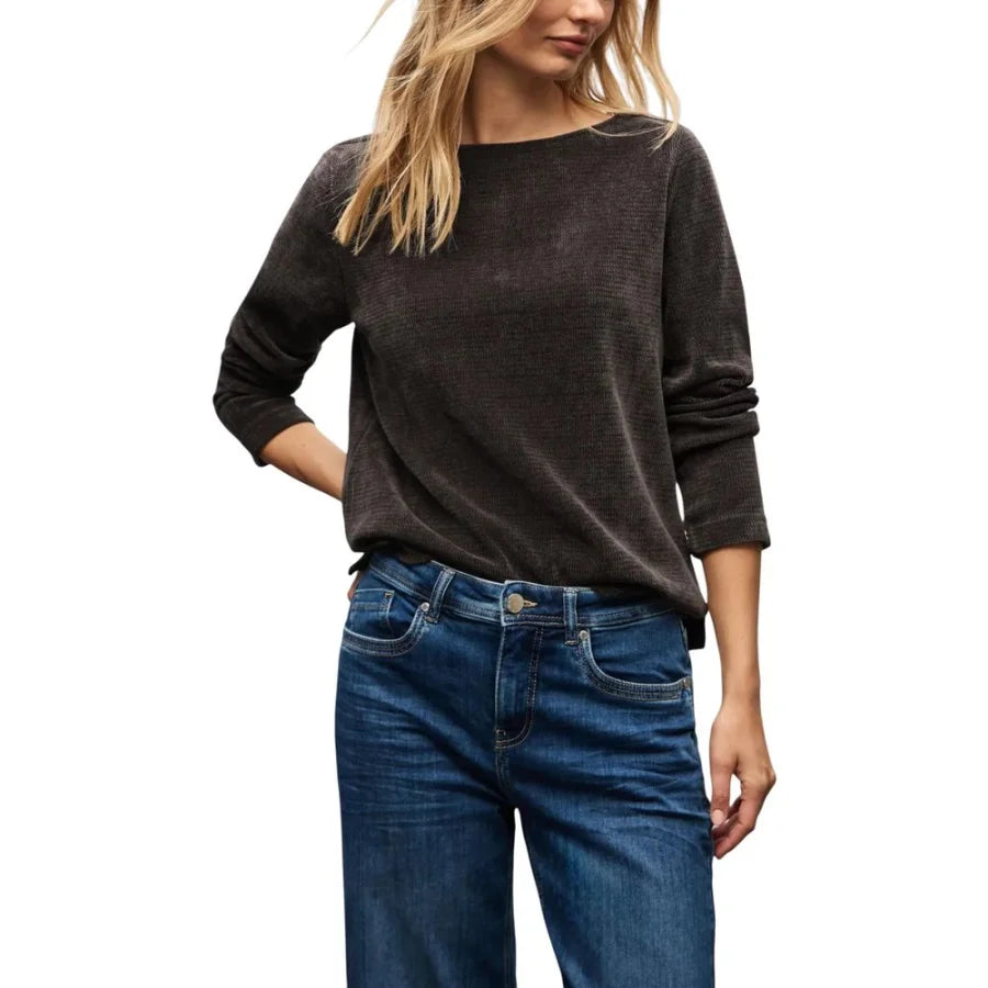 The Street One Cosy u-boat neck shirt 323839 for women combines comfort and style in a single garment. Made from a soft knit fabric with 98% polyester and 2% elastane/lycra, it offers a pleasant, slightly stretchy fit that gently hugs the silhouette. The design features a refined boat neckline, long sleeves, and a subtle textured finish, making it perfect for both casual and informal occasions. Quality craftsmanship and attention to detail make this shirt a versatile must-have for the season.