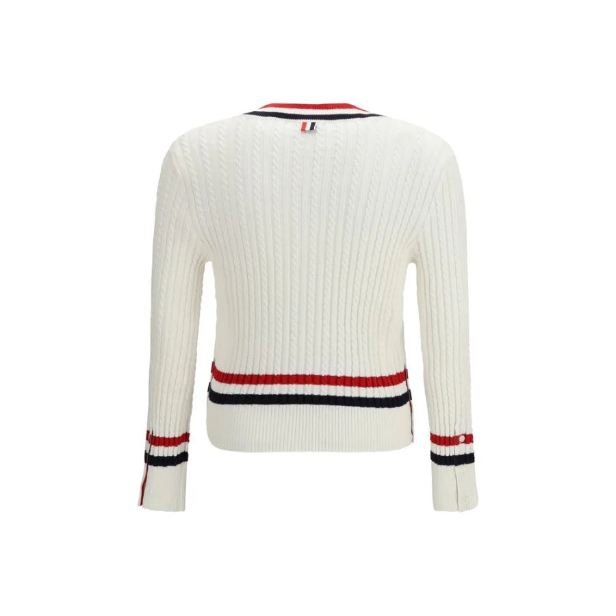 The intarsia cable-knit V-neck Sweater by Thom Browne reimagines the classic cricket pullover with a distinctive contemporary elegance. Featuring a refined cable-knit construction, it is designed with a V-neckline that enhances the silhouette. Button details add a subtle graphic accent, while ribbed cotton cuffs and hem provide a balanced and polished fit.